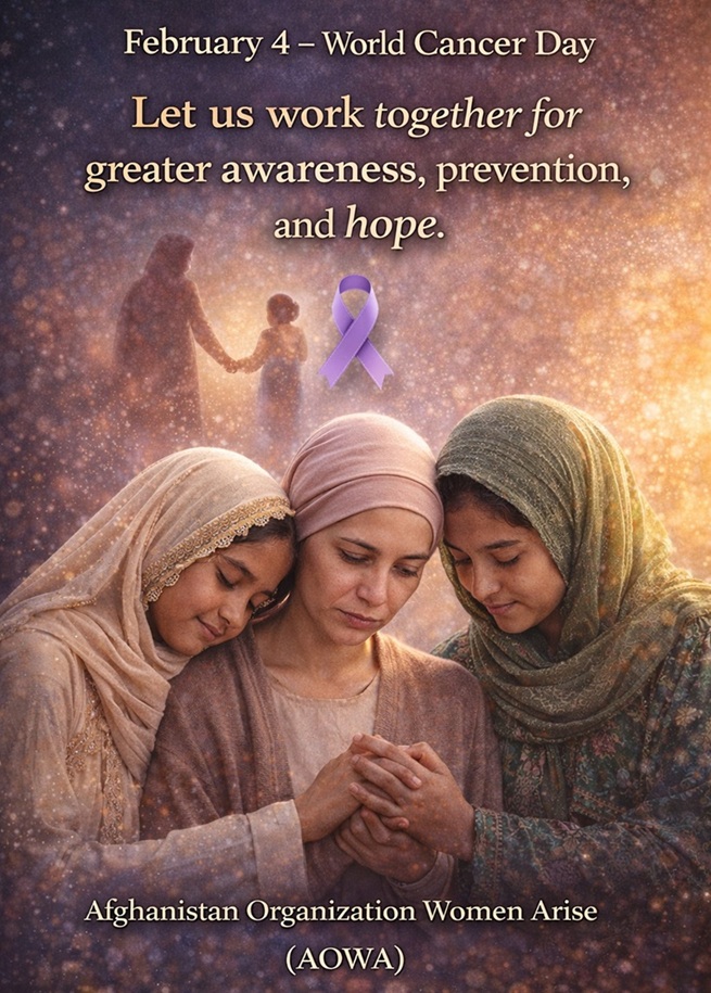 موسسه طلوع زنان افغانستان (AOWA) باور دارد که مبارزه با سرطان نیازمند همکاری مشترک میان افراد، خانواده ها، نهادهای صحی و جامعه است. ترویج سبک زندگی سالم، توجه به تغذیه مناسب، فعالیت بدنی، کاهش عوامل خطرزا و مراجعه به موقع به مراکز صحی، از مهم ترین گام های پیشگیری و کنترل این بیماری محسوب میشود.