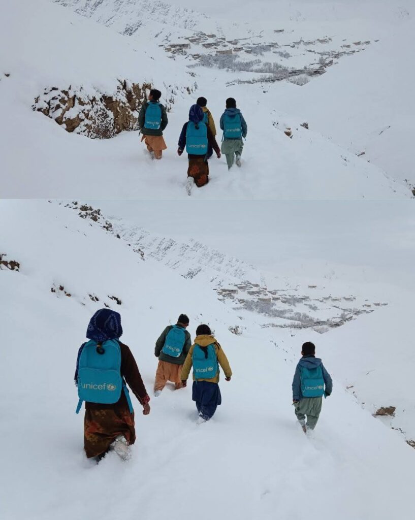 دا انځور یوه ترخه رښتیا څرګندوي؛ هغه ماشومان چې د یخنۍ، واورې او سختو لارو سره سره، بیا هم د زدهکړې په هیله روان دي.